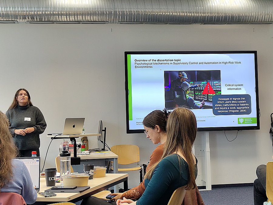 Aus dem Team der Arbeits- und Umweltpsychologie nahm Maike Ramrath teil und stellte im Rahmen einer Short Discussion ihre geplante Dissertation zu Vertrauen und User Experience in der Mensch-Technik-Interaktion vor. Das Format bot die Möglichkeit, die eigenen Forschungsfragen und Studiendesigns intensiv zu diskutieren und wertvolles, konstruktives Feedback von anderen Promovierenden und erfahrenen Forschenden zu erhalten.
